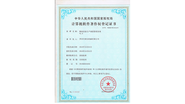 著作登記公司已通過了ISO9001質量管理認證、ISO14001環(huán)境管理體系認證和ISO45001職業(yè)健康安全管理體系認證。為中國儲備糧管理總公司糧機設備的A級供應商、安徽省高新技術企業(yè)、擁有阜陽市企業(yè)技術中心。